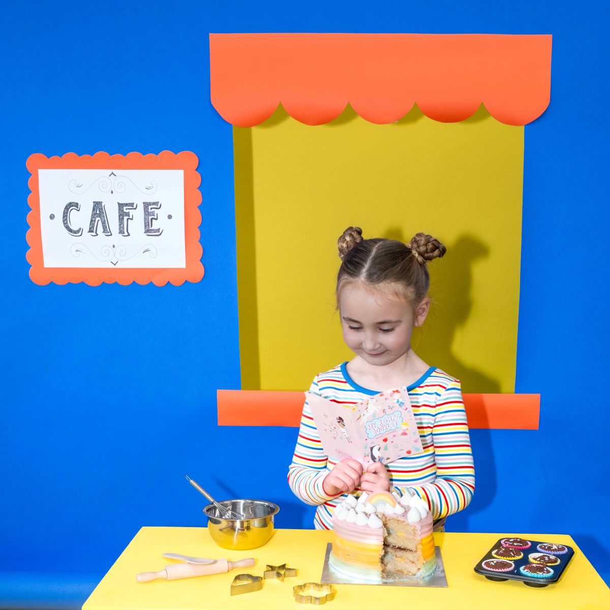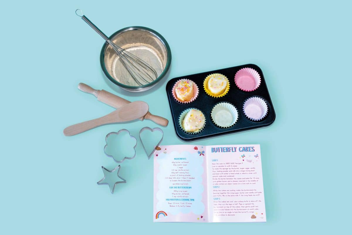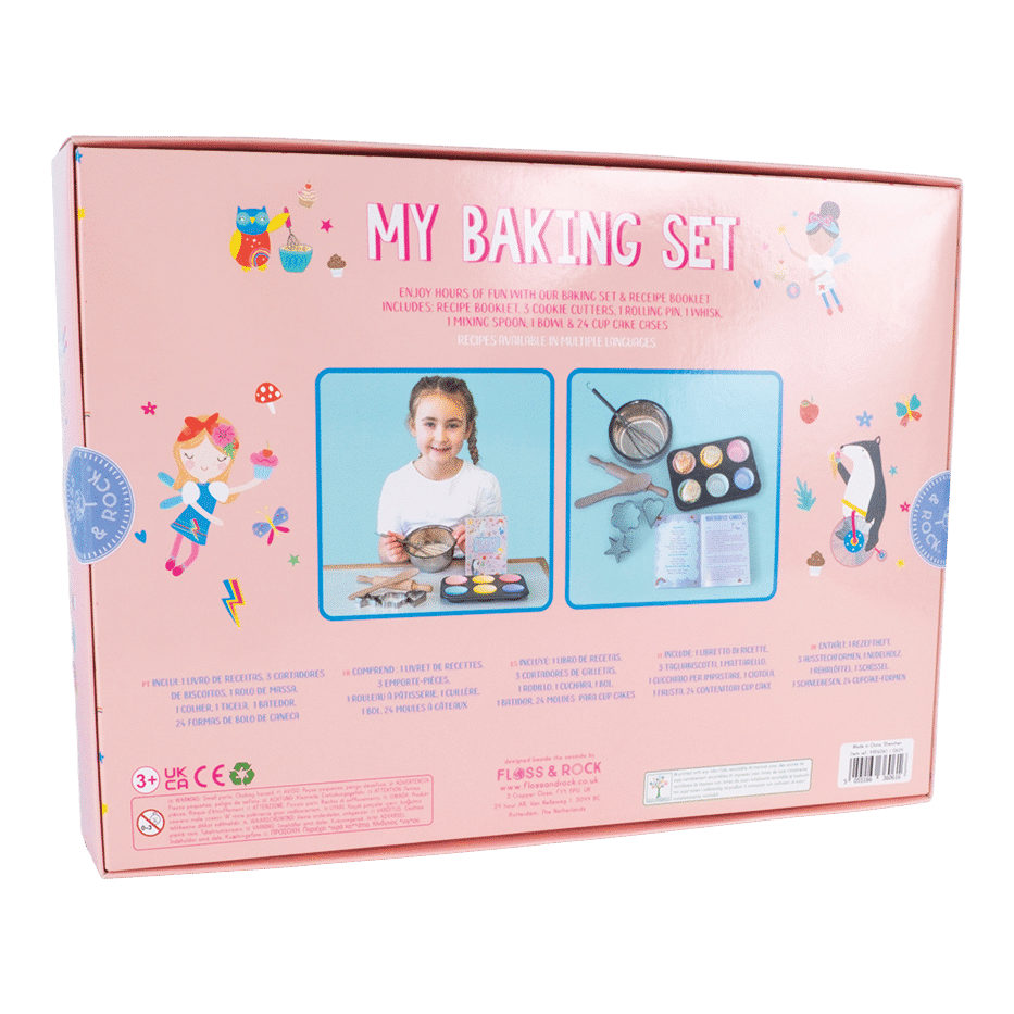 Complete with an informative recipe booklet, 3 cookie cutters, 1 rolling pin, 1 whisk, 1 mixing spoon, 1 bowl and 24 cupcake cases.