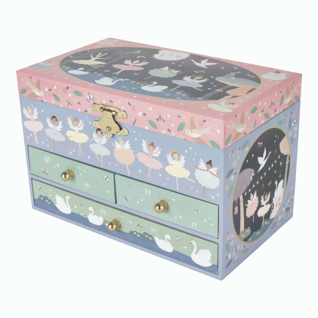 The Enchanted Jewellery Box is covered with gorgeous illustrations of ballerinas, swans and more. The three handy drawers are perfect for storing treasured trinkets. Wind the key up at the back, then lift the lid to see a beautiful ballerina twirl around to the tune of ‘swan lake’.