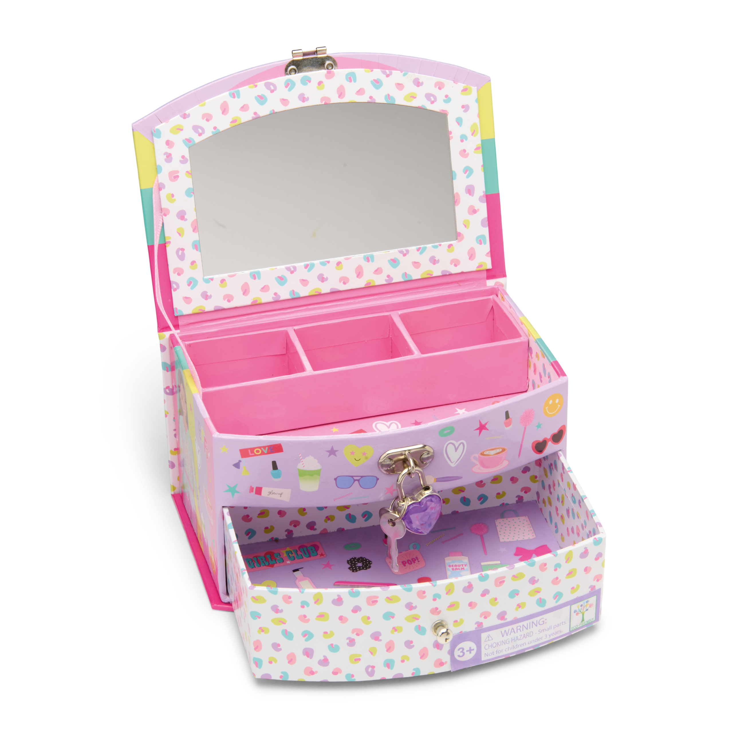 A beautifully decorated lockable Jewellery Box, perfect for fabulous Fashion Friends! Complete with a handy drawer, inner compartments and a mirror. Lock it up and keep your treasures safe with the heart shaped gem padlock (comes with two keys!)