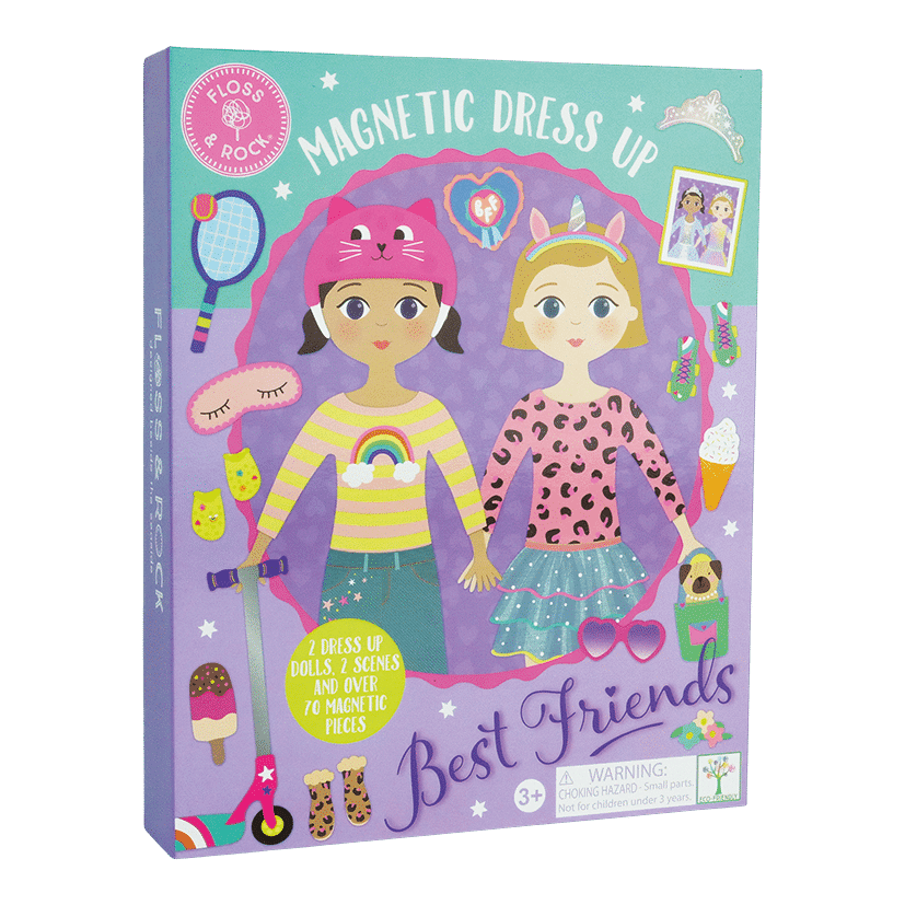 Includes 2 magnetic dolls (who are also the BEST of friends), contains over 70 magnetic outfit and play pieces to mix and match for endless combinations. Fold the box out to create a magnetic play room scene and a fun outdoor play scene! The lovely reusable box comes with a magnetic closure and keeps all parts safe for next time!
