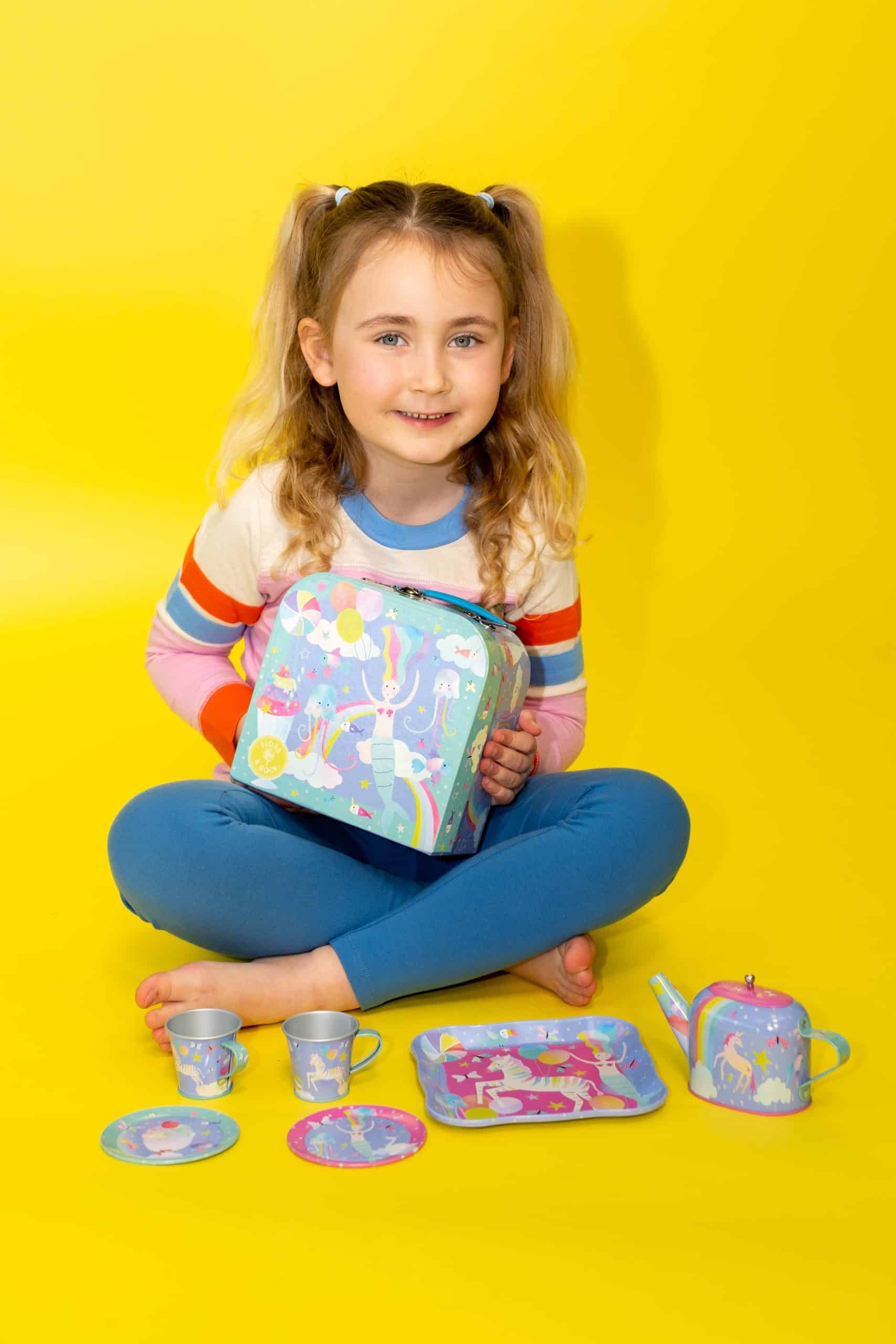 Have a tea party with the mermaids and fantasy animals supplied in a reusable-foiled carry case. This 7 piece tea set includes: 2 tea cups and saucers and a lidded teapot.