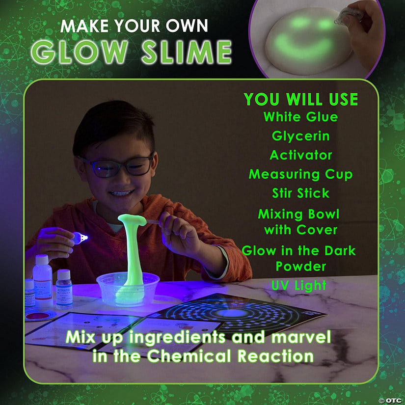 - Includes detailed informational guide book, over 300 colored gems, atom display board, glue, glycerin, activator, glow-in-the-dark powder, measuring cup, mixing and storage bowl, UV flashlight, paintbrush, white paint, scanner and skeletal system poster