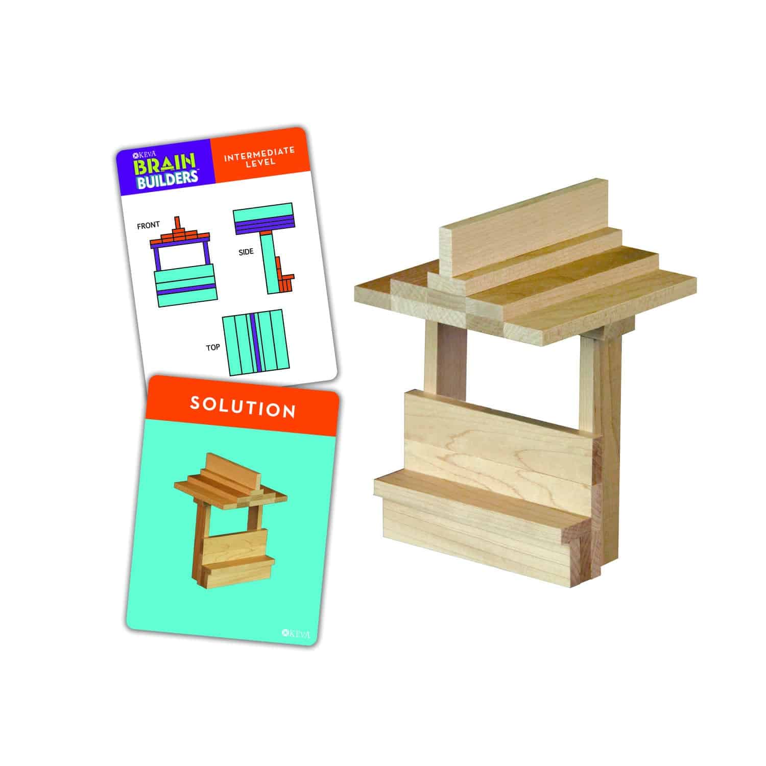 Brain Building Planx combines 20 KEVA planks with a set of double-sided puzzle cards. Each stimulating card features a 2-D challenge on one side and its solution on the other. The goal is to recreate 2-D patterns into 3-D structures. The 2-D cards show the design from different angles highlighting the front, side and overhead view and increase in difficulty from beginner to expert.