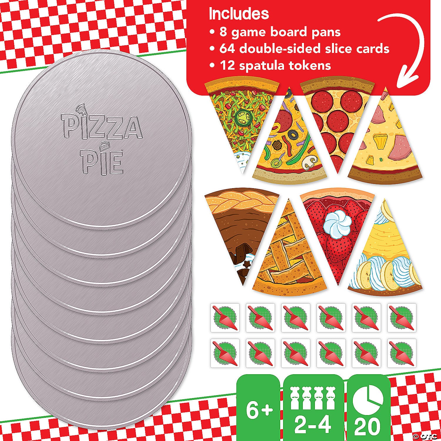 • Includes 8 gameboard pans, 64 double-sided slice cards, 12 spatula tokens and rules