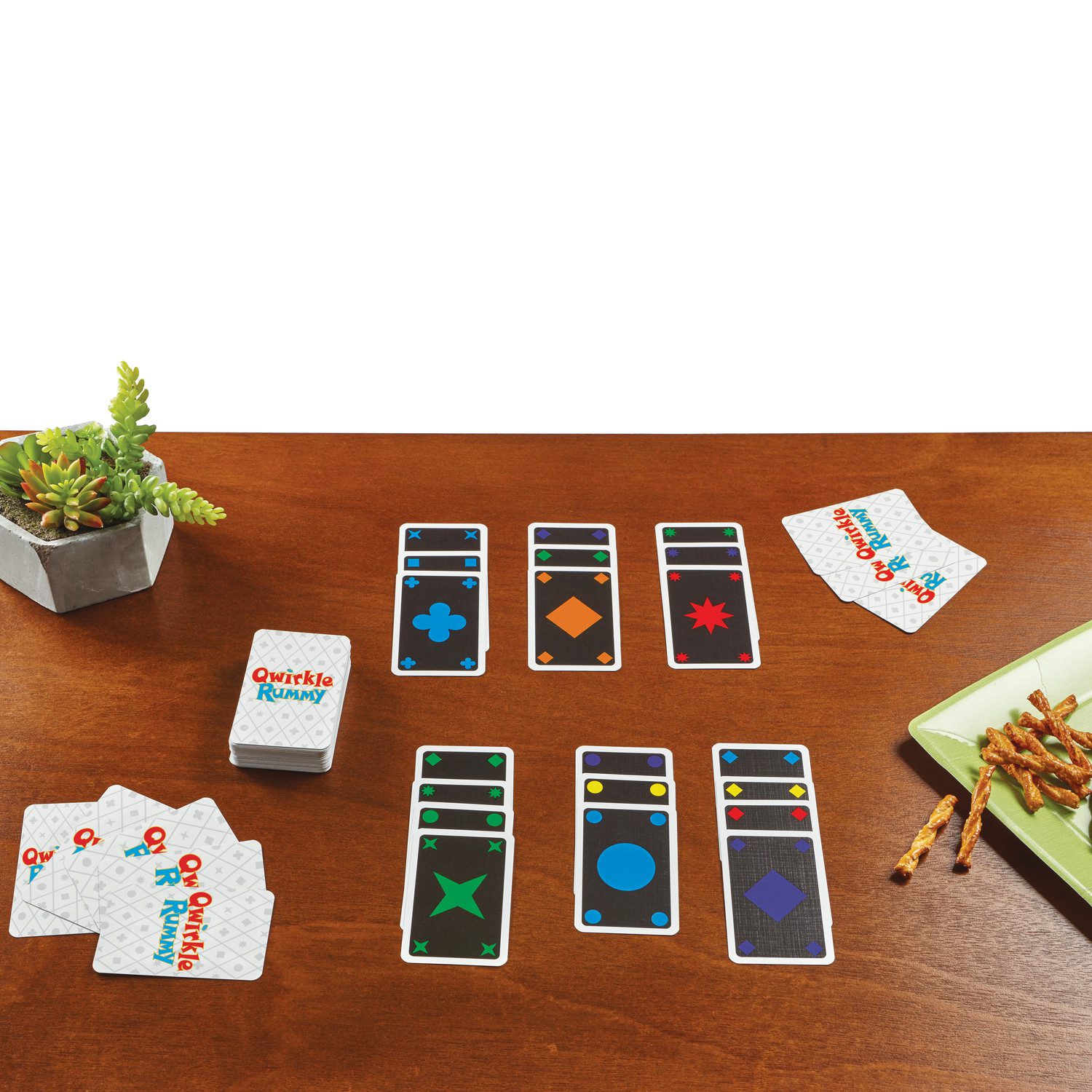 Qwirkle Rummy is the fun family card game where players create sets by matching shapes or colors. Any player can add to any set or switch cards in the sets, but the real pay off happens when a set of all 6 is completed and a Qwirkle is scored.