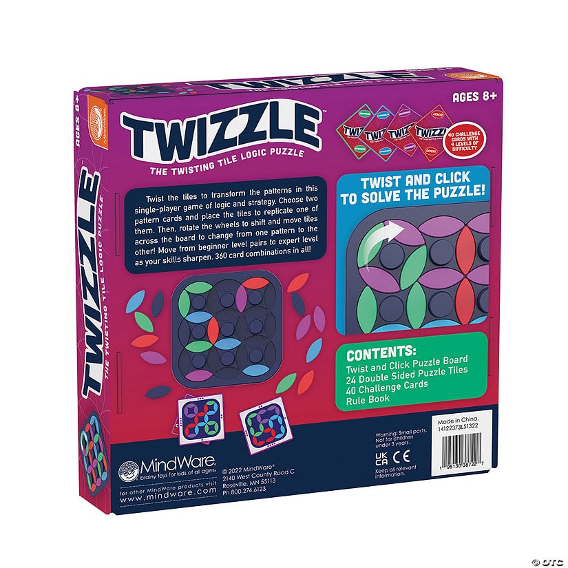 Twist, click, solve! Players begin with one pattern and must twist the wheels and shift the tiles until the end pattern is reached. With 360 card combinations in all, players can progress from beginner to expert as their skills improve. Kids and adults alike will enjoy this single-player game of logic and strategy!