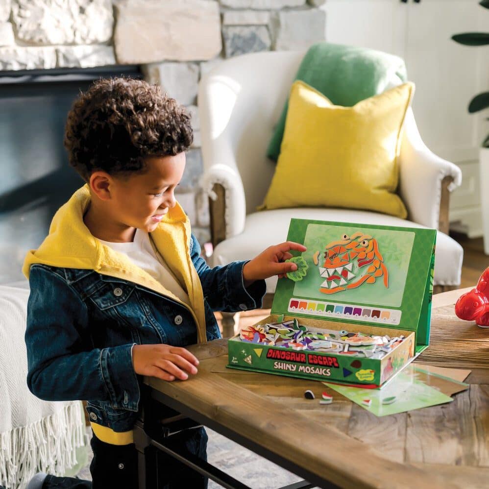 Set includes the Dinosaur Escape Board game and Dinosaur Sparkle Mosaics