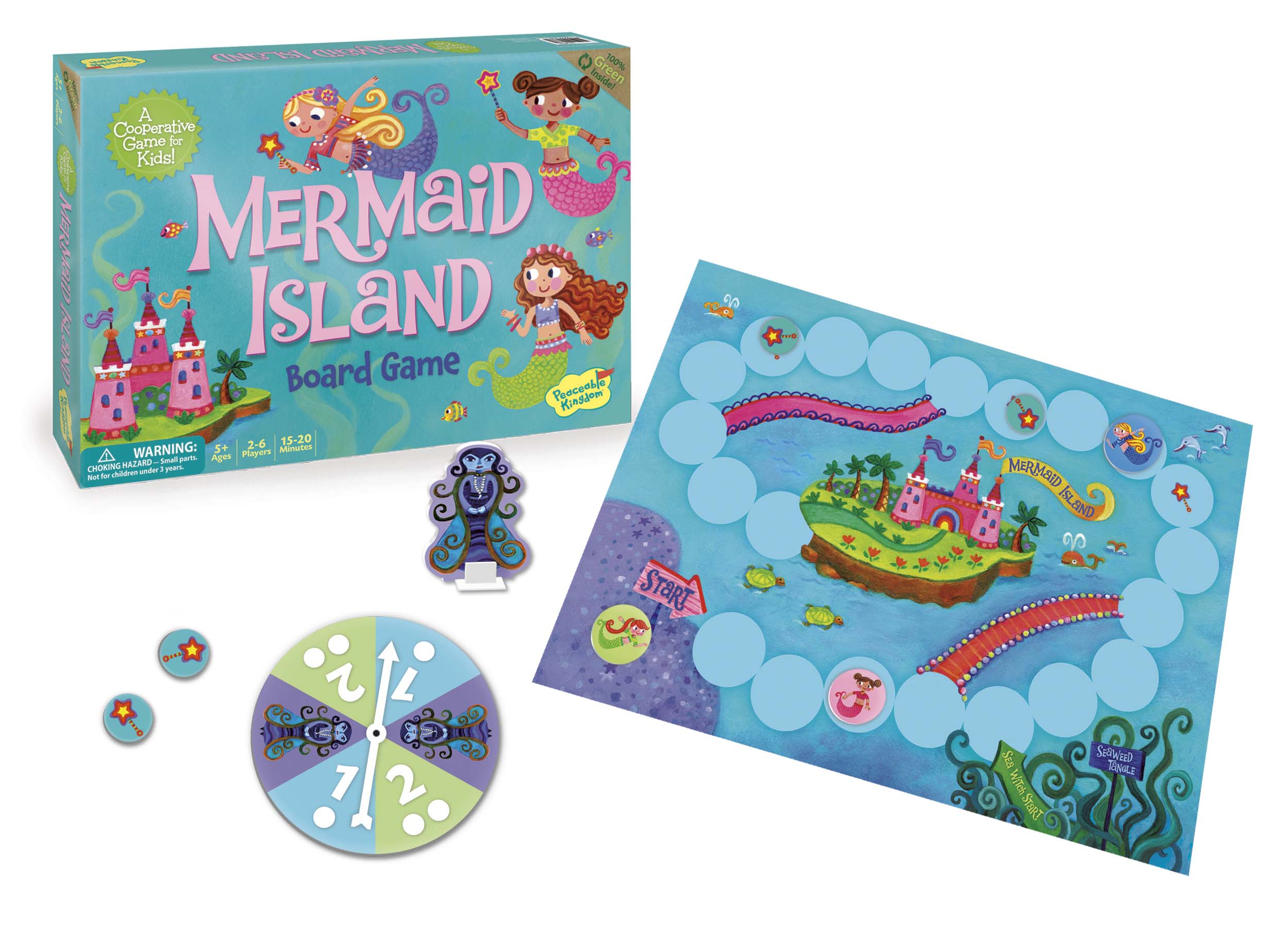 Watch out, Mermaids! The Sea Witch is on the move! The object of the game is to move all 3 mermaids from start to Mermaid Island before the Sea Witch gets there. Because Mermaid Island is a cooperative game players play any of the mermaid tokens – no one player has a single mermaid she is trying to get back to the island.