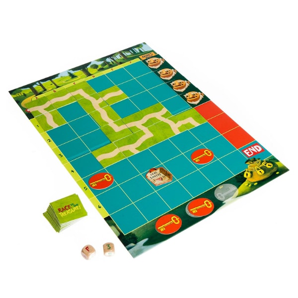 Players try to beat the Ogre to the treasure by creating a path from START to END. Along the way they need to collect 3 keys to open the treasure. Players strategize, cooperate and build the path together. If they do it before the Ogre gets there, they win!
