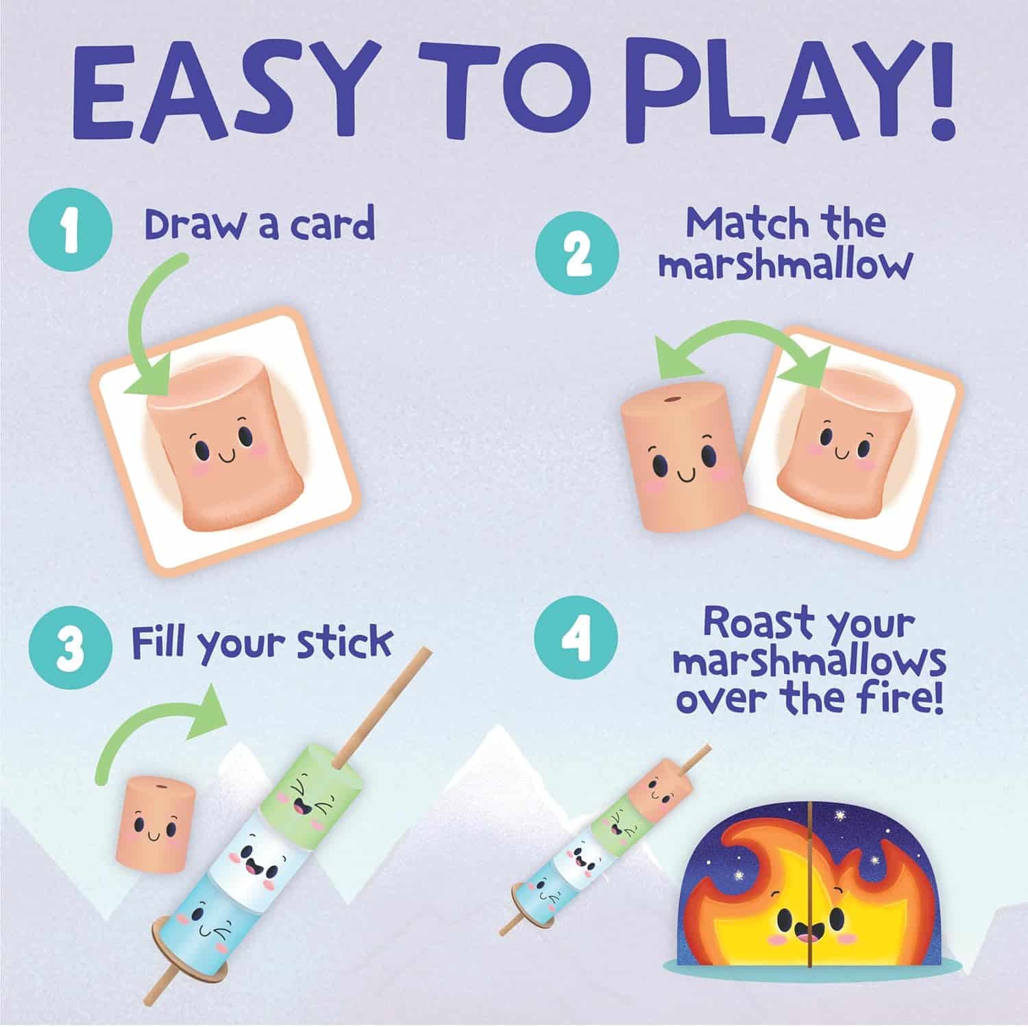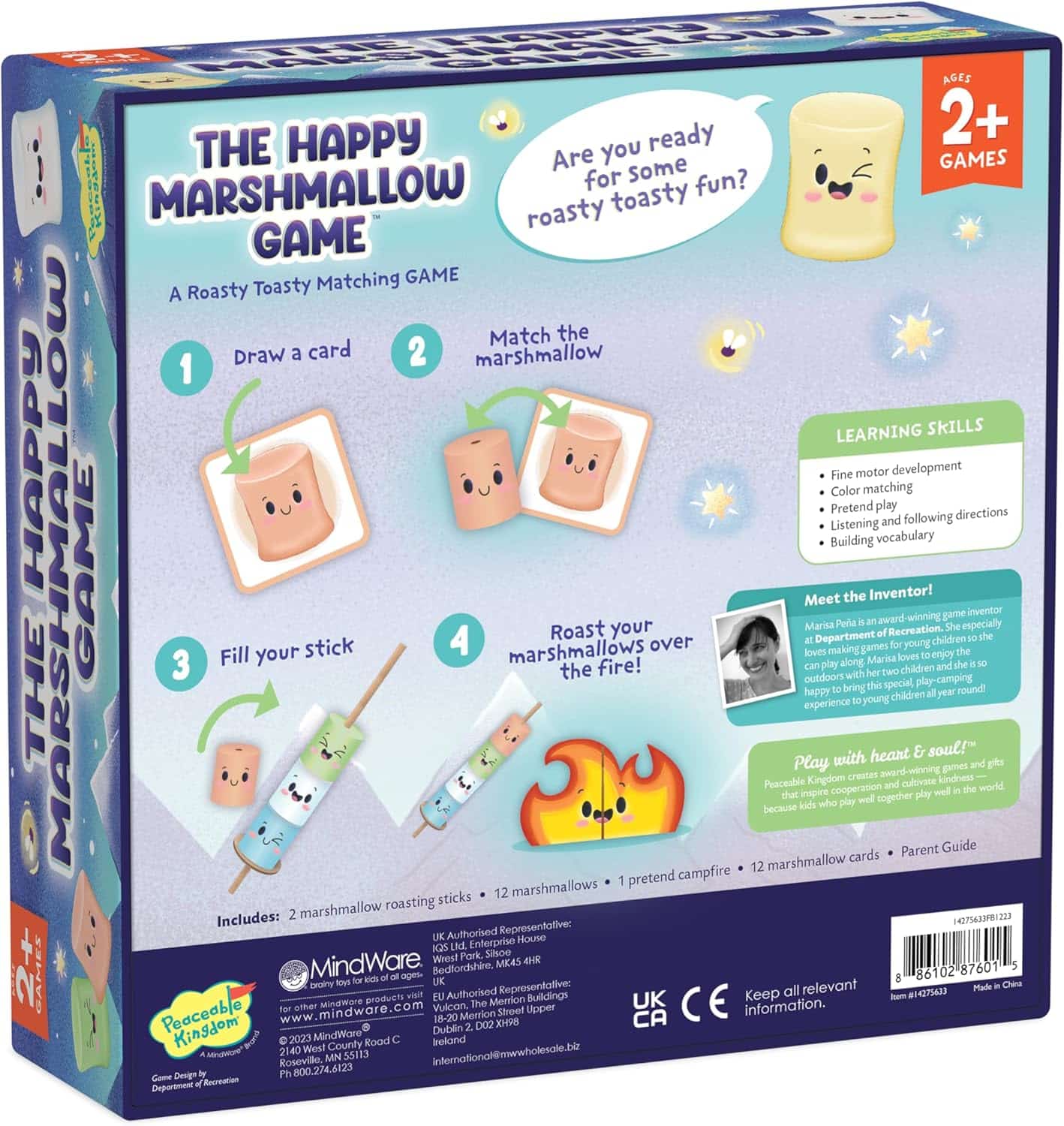 • Includes 2 marshmallow roasting sticks, 12 marshmallows, 1 pretend campfire, 12 marshmallow cards, and parent guide