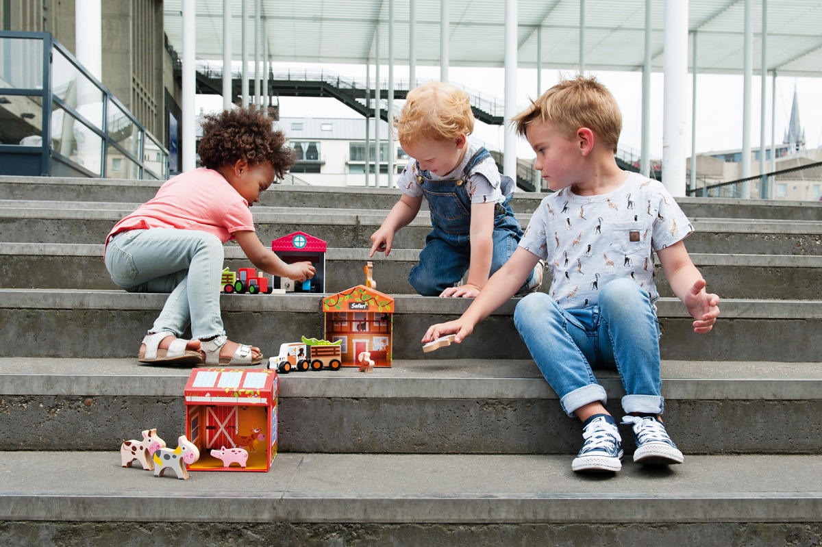 Farm – There is a lot to discover on the play farm. Vroom vroom, the tractor is bringing the hay to the stable. What sound does the cow make? Which animal goes oink oink? Teach the littlest ones about the animals at the farm in a playful way. You transform the box into a play farm, and beautiful wooden animals and tractor are included.
