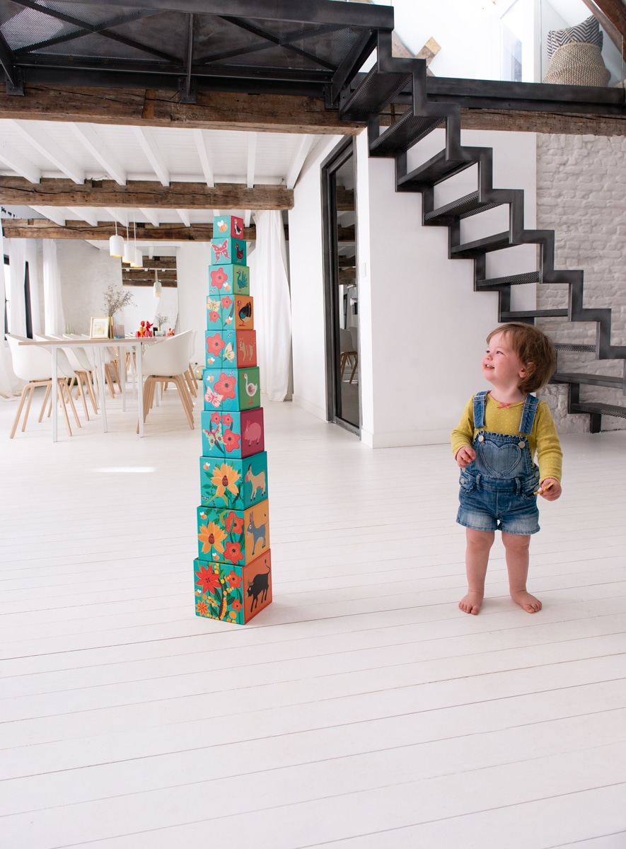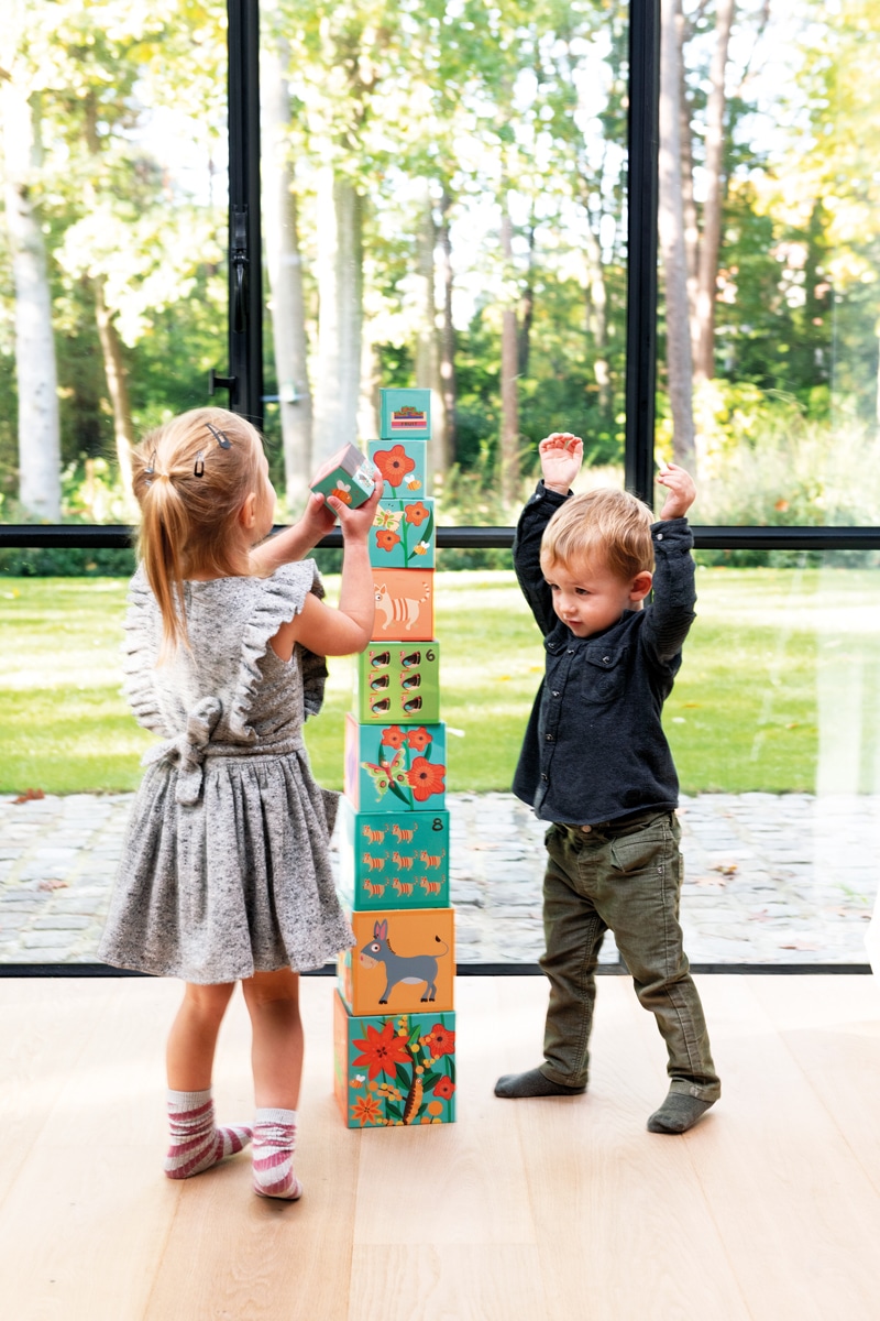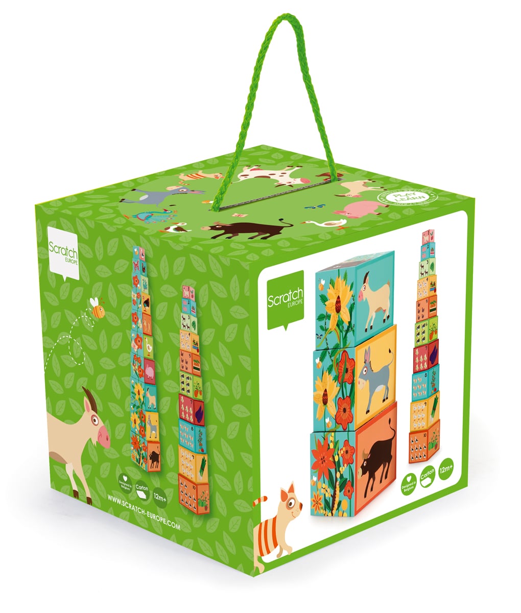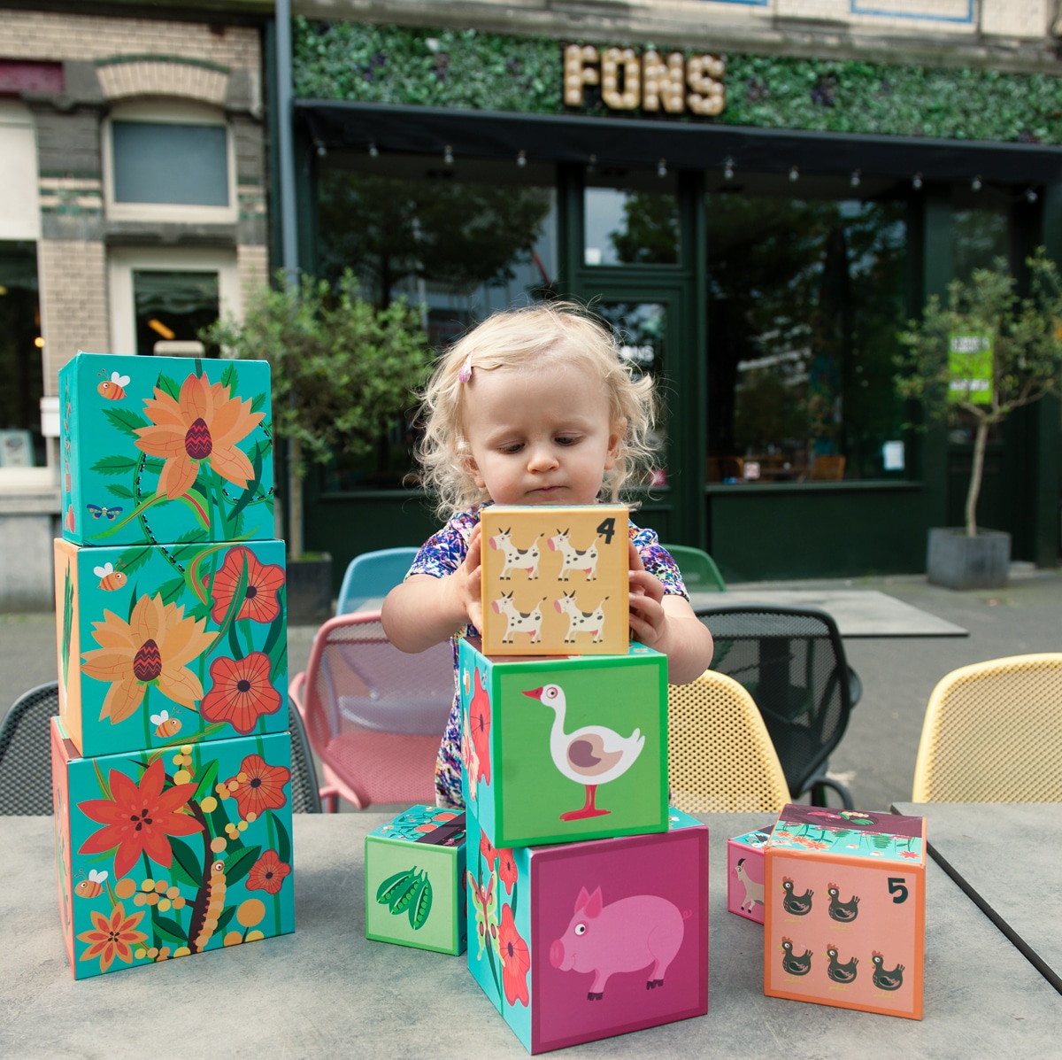 A cheerfully coloured stacking farm tower with 10 cubes in different sizes. The cubes can be stacked on top of each other, but also laid next to one another as a puzzle. Try and complete the hidden puzzle by putting the squares with the correct sides together. Five of the six sides have animals, figures and numbers on them. Fun, but also educational. Stack, puzzle, count, recognise animals and figures, and much more. Made of sturdy and durable cardboard.
